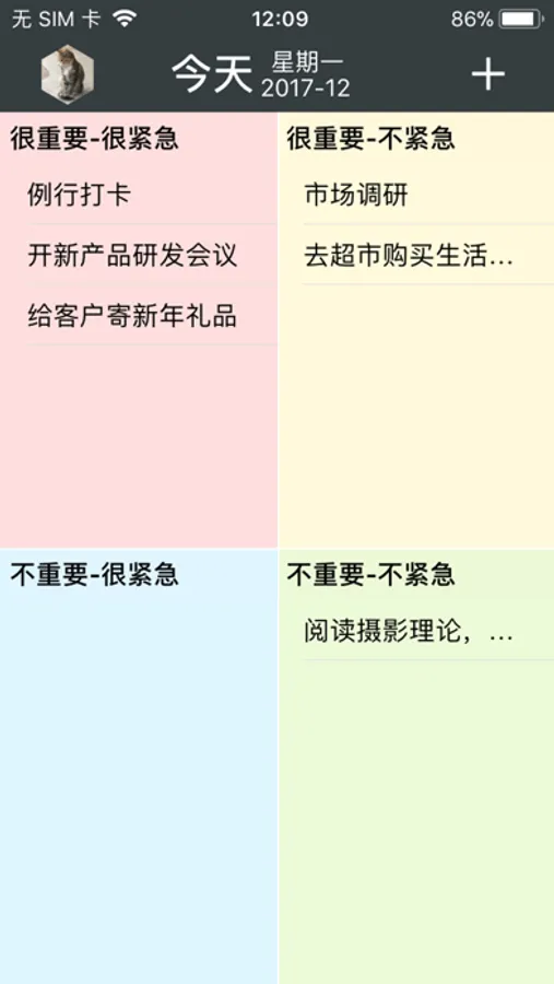高效Todo的主要界面采用了四象限的形式。按照重要紧急程度把事情分成了四类。
