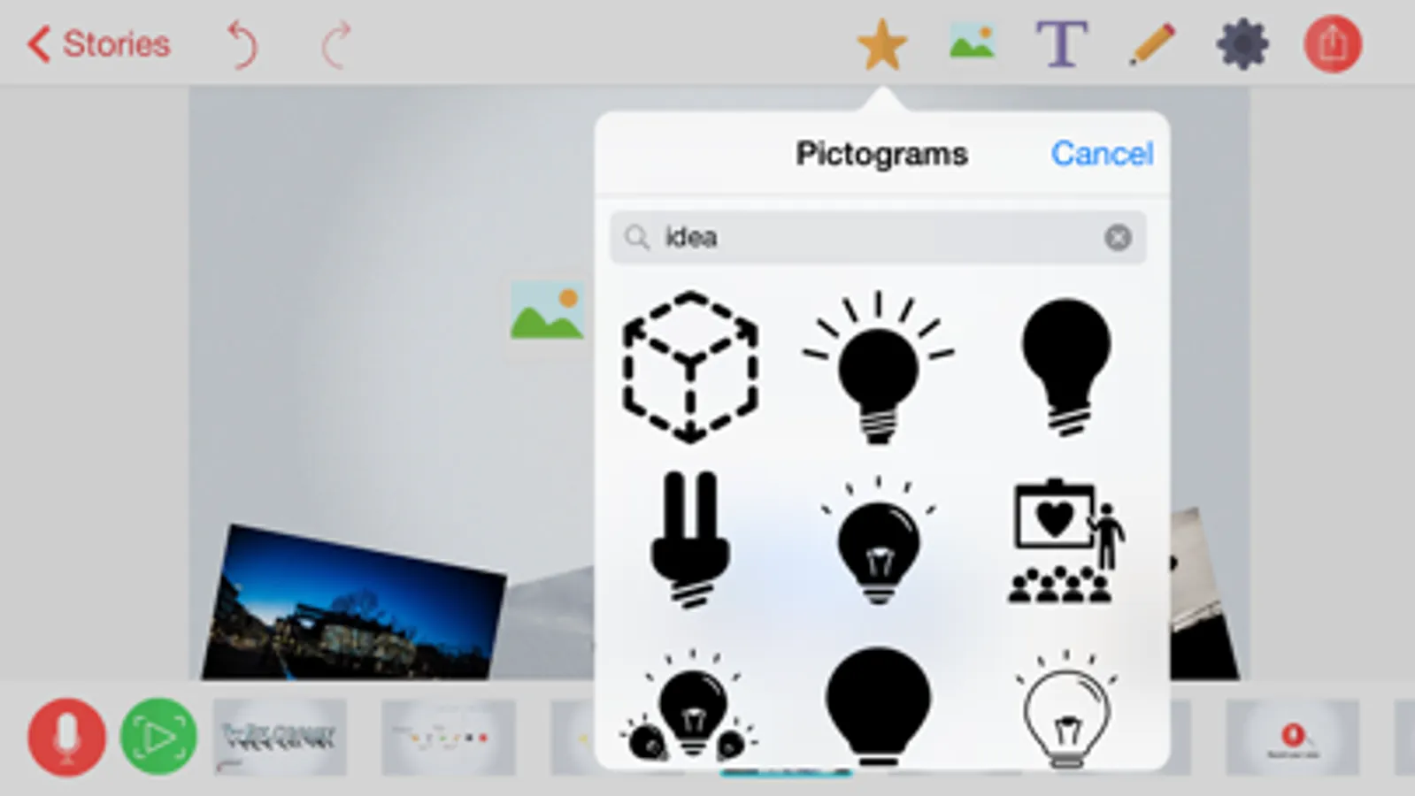Search among thousands of pictograms by name and keyword to tell the best story! Use your own SVG graphics.