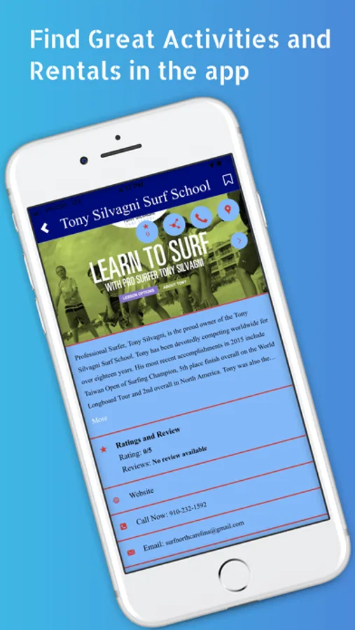 The Carolina Beach app connects you to local businesses. Find what you want, where you are: listings include distance from your current location. You will never be lost, with precise GPS directions to every destination. Information is updated in real-time. Everything is easily accessible, including: