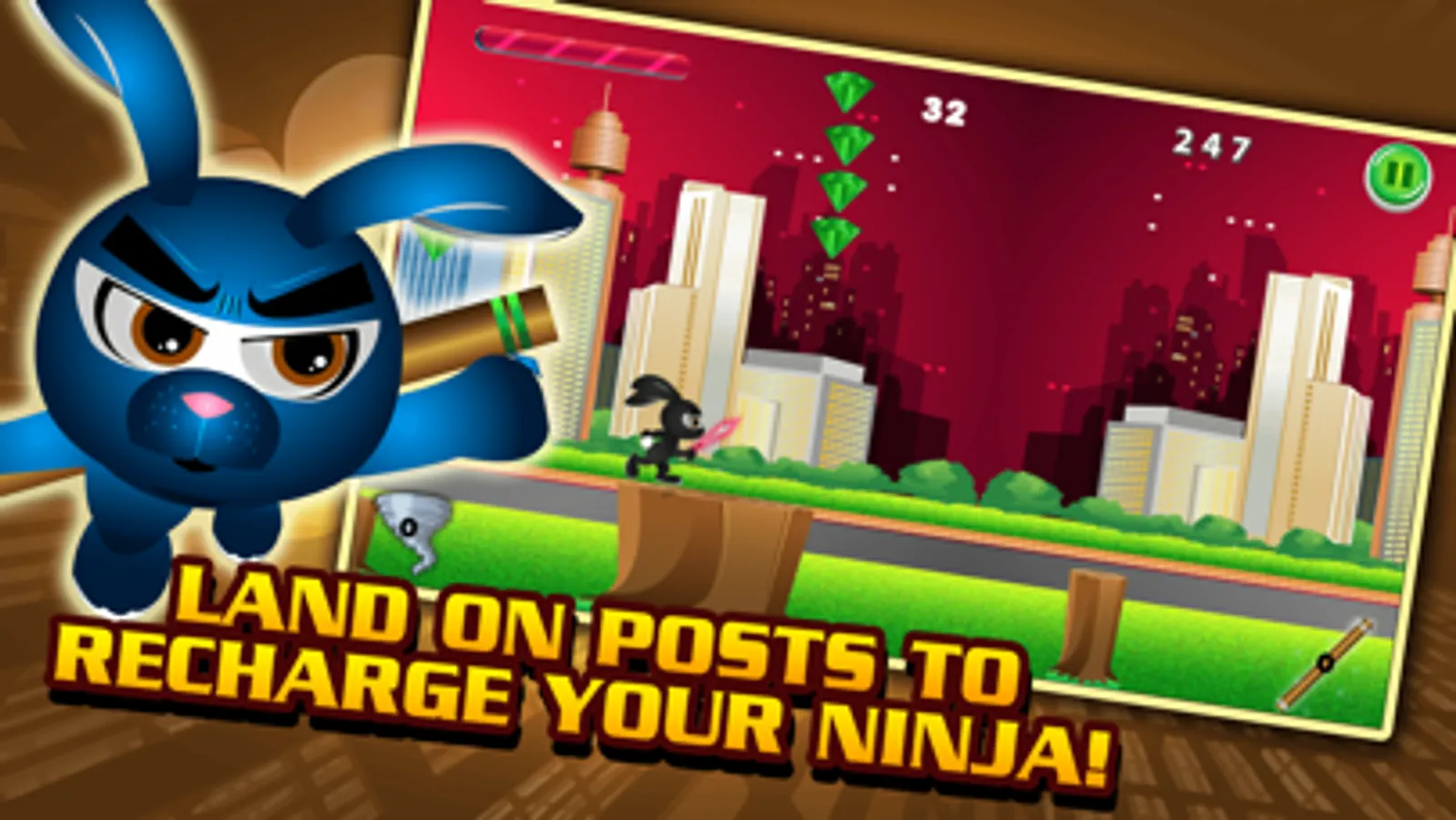 Your Mighty Ninja Rabbit uses Energy to jump from post to post but the energy can run out - so if you land your Ninja correctly on the posts - the energy level will be fully recharged! But you must not let the Ninja stay too long because the wooden posts will decay and the game will end!