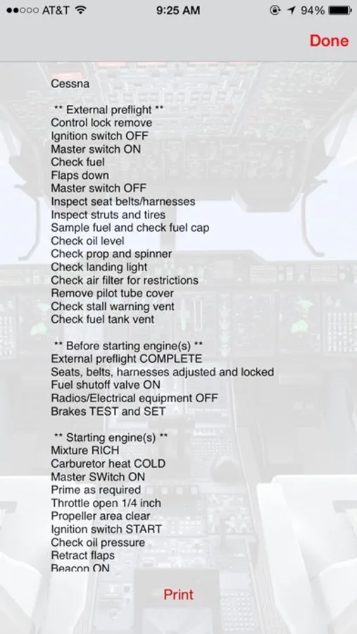 Pilots Checklist lets you create as many safety checklists as you want. You add the type aircraft you want and the app preloads a generic list of items. You can then add to, subtract from, and rearrange the items to customize the list to your liking. When your done the app saves the list under the plane name you chose for it. You can also print a copy of the list to give to other pilots or to save as a hard copy.