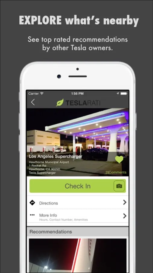 • Find nearby restaurants, interesting points of interest, WiFi tips and fun things to do around charging locations, as recommended by other Tesla owners.