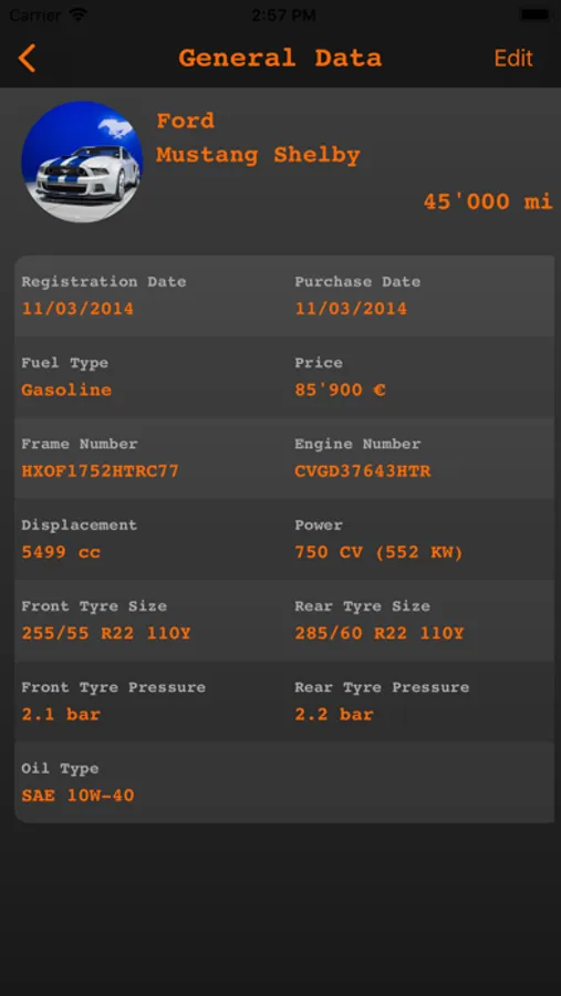 • Consult quickly the data of your vehicle, the license plate number, chassis, engine number, the tires size and the relative pressure or the type of oil to use.
