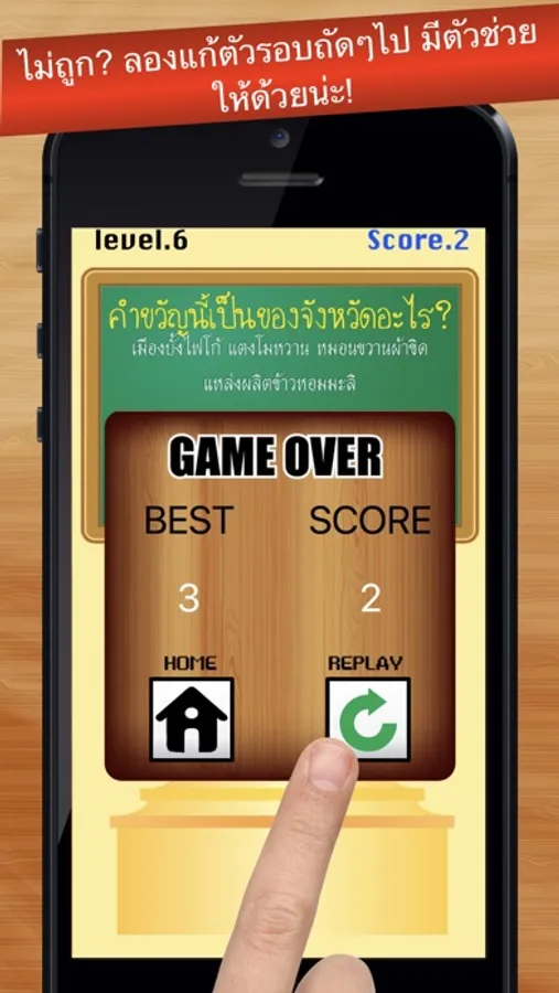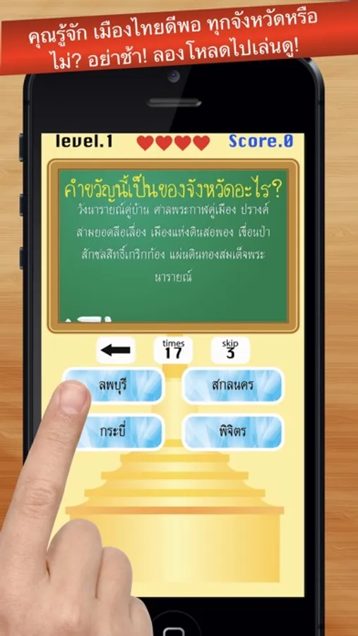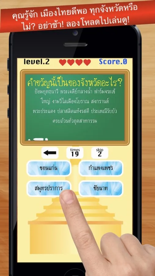เลือกคำตอบ (ชื่อจังหวัด) ให้ถูกต้อง ตามคำขวัญประจำจังหวัดนั้นๆ ให้ถูกต้อง เป็นปริศนาให้คาดเดาและทดสอบความจำของคุณ ไม่เพียงแค่นั้น คุณยังมีตัวช่วย
