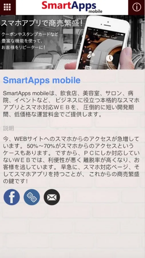SmartApps mobileは、飲食店、美容室、サロン、病院、イベントなど、ビジネスに役立つ本格的なスマホアプリとスマホ対応WEBを、圧倒的に短い開発期間、低価格な運営料金でご提供するプラットフォームです。