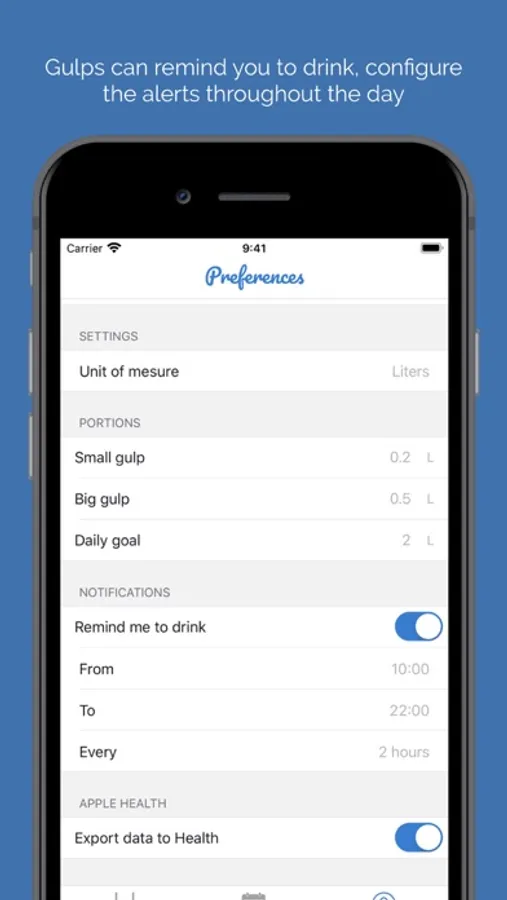 Gulps lets you track your daily water intake in a simple and intuitive way: set your goal, set your usual portion, and start keeping track from within the app or the widget in your notification center.