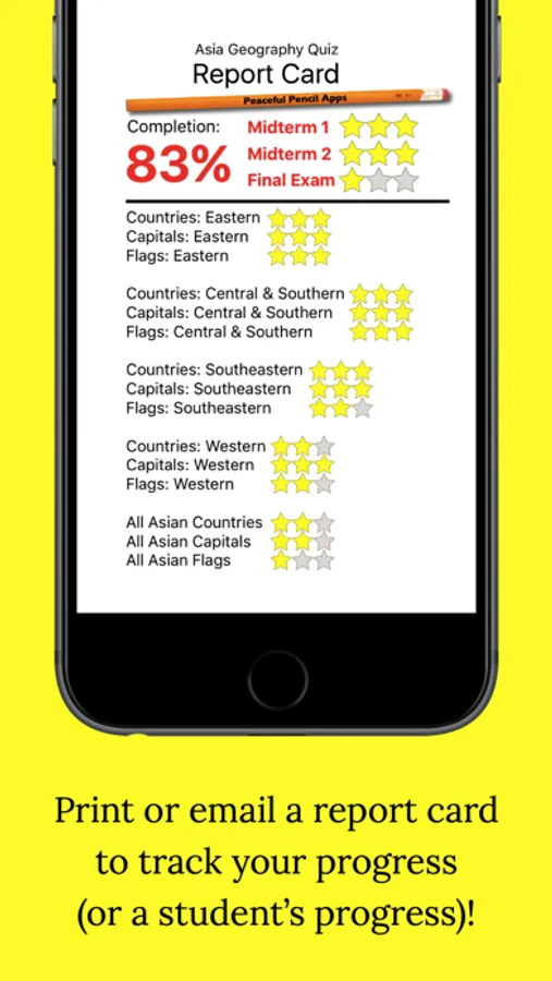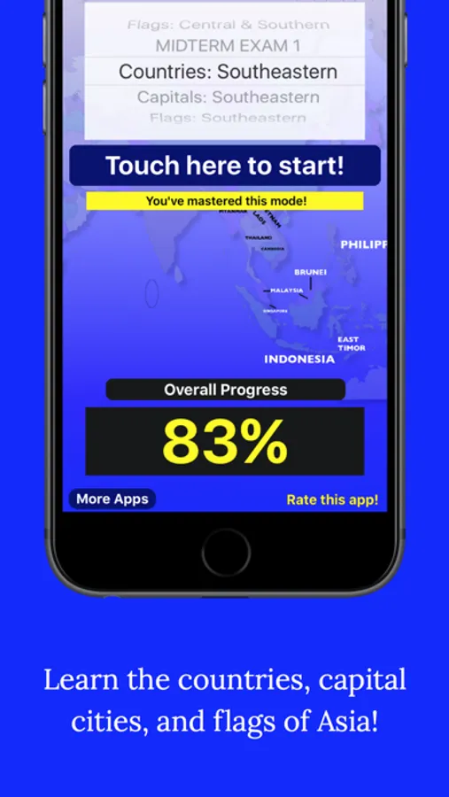The ‘Eastern’, and 'Central & Southern' regions are included for COUNTRIES, CAPITALS and FLAGS modes. A single In-App Purchase unlocks the full version.
