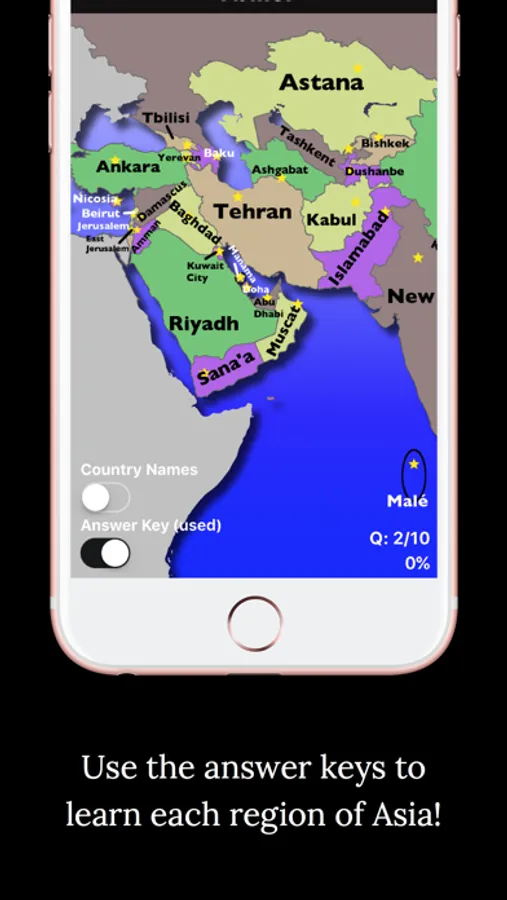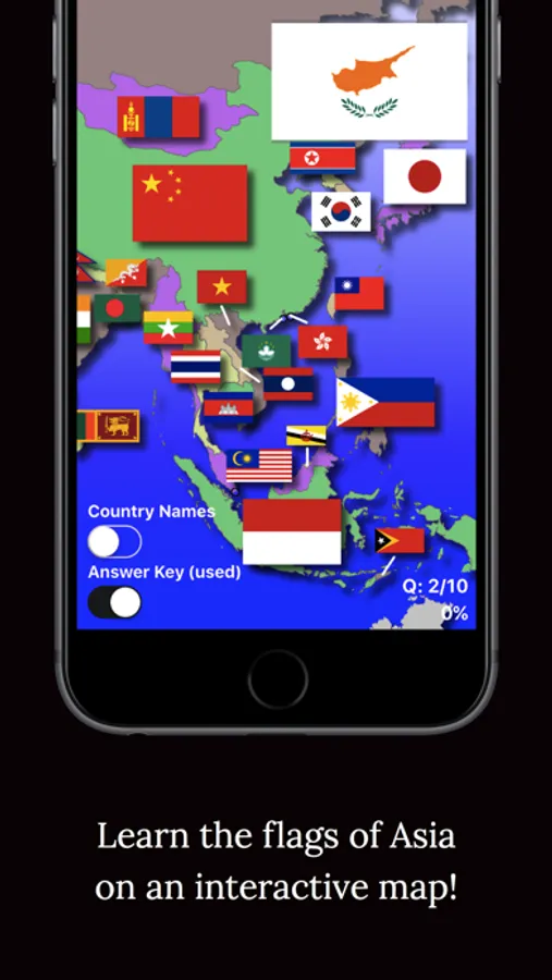 Learn the location of Asian countries, capitals, and flags with interactive learning: ZOOM, SCROLL, and TAP your way to learning the geography of Asia. No multiple choice, no keyboard, and, best of all…No word scrambles!