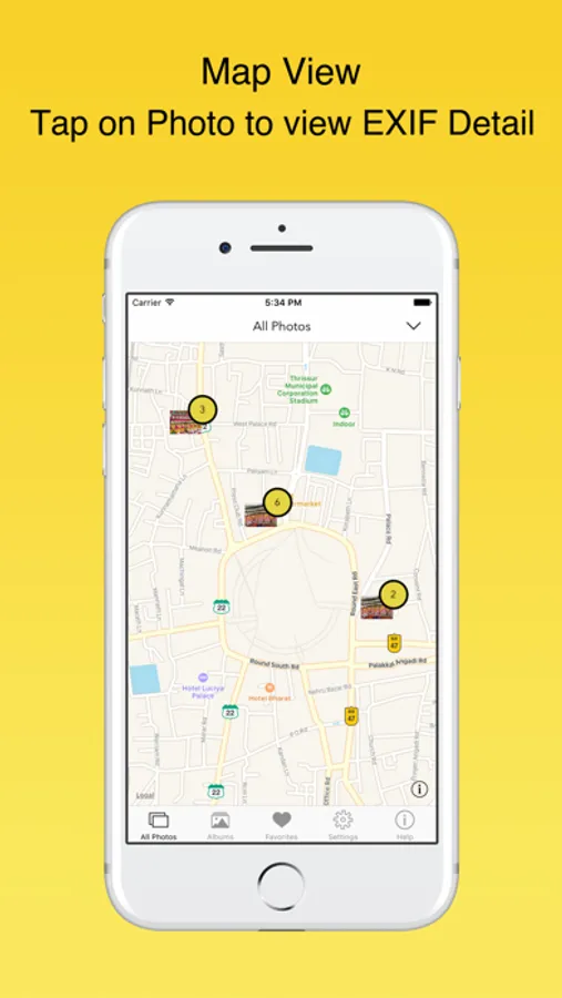 3) Map view shows cluster of photos on the map and view EXIF Details by tapping on photo (Satellite & Standard view)