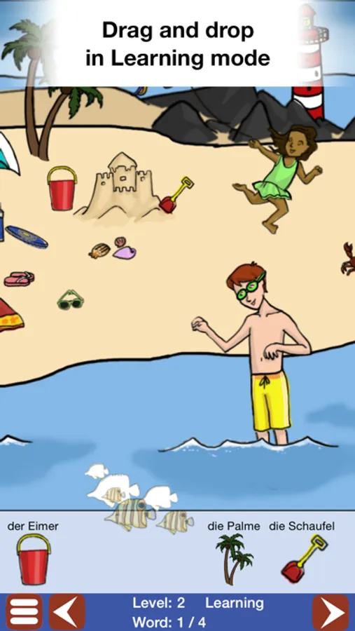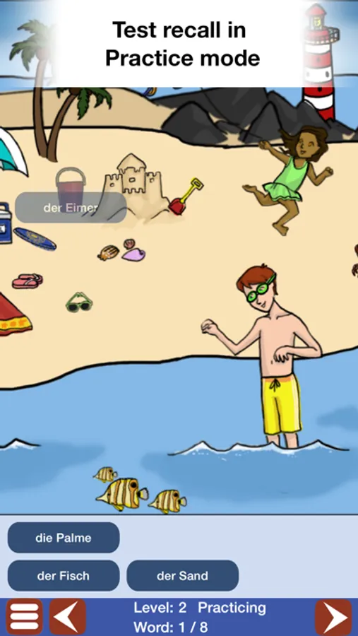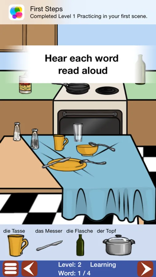 Each level begins with a Learning mode, showing you the picture and the word, then kicks it up a notch to a Practice mode in which you must match the German word to its place in the scene. Challenge yourself to complete every scene and earn Game Center achievements!