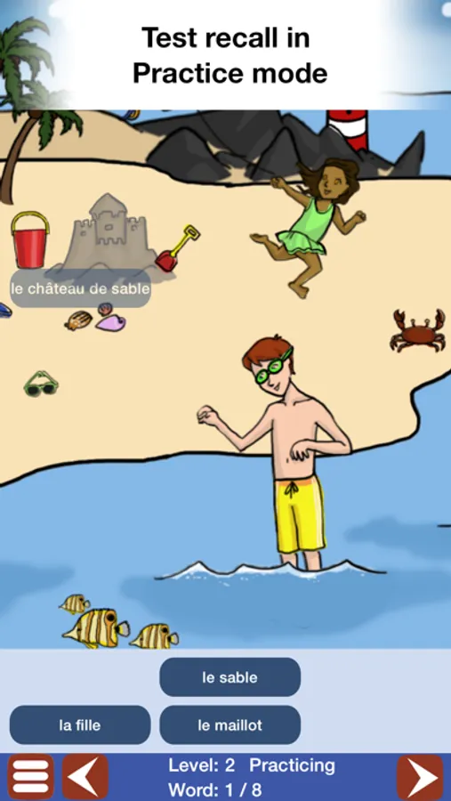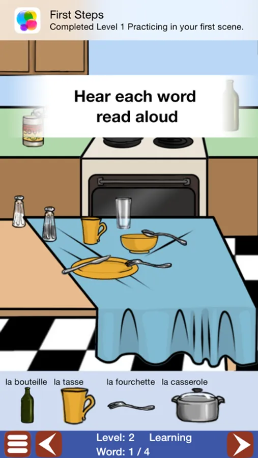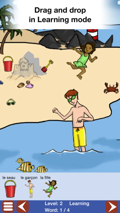 Each level begins with a Learning mode, showing you the picture and the word, then kicks it up a notch to a Practice mode in which you must match the French word to its place in the scene. Challenge yourself to complete every scene and earn Game Center achievements!