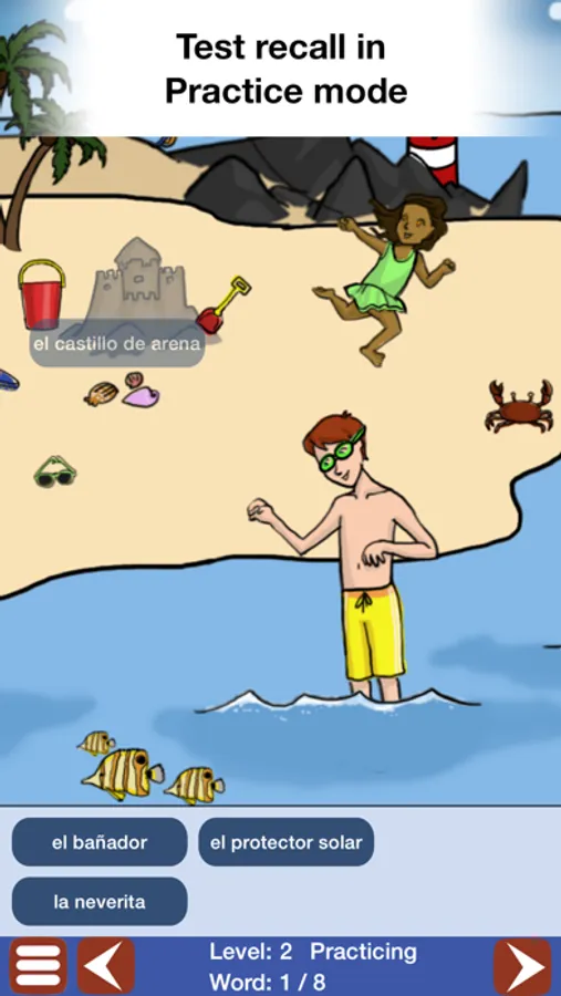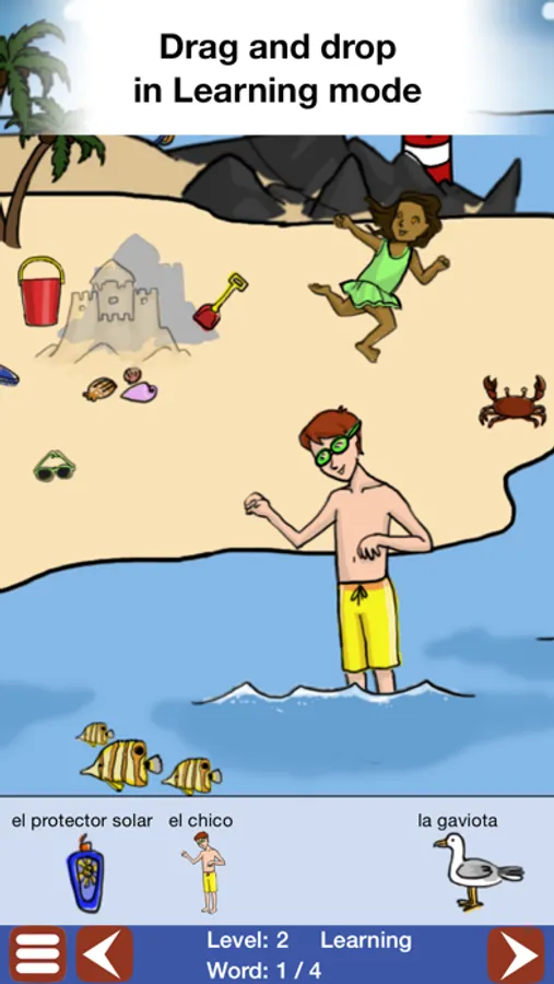 Each level begins with a Learning mode, showing you the picture and the word, then kicks it up a notch to a Practice mode in which you must match the Spanish word to its place in the scene. Challenge yourself to complete every scene and earn Game Center achievements!