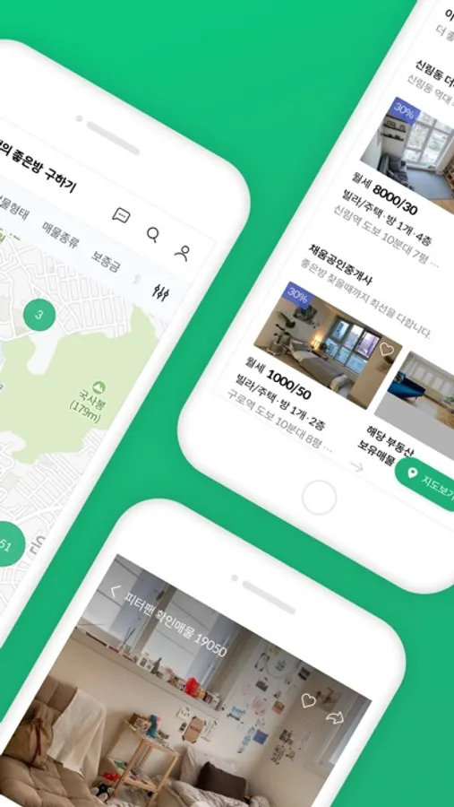 - 실시간 매물: 전국 아파트, 빌라, 원룸, 오피스텔 매물 등록 즉시 확인