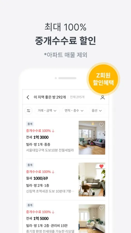- Z회원 혜택: 중개수수료 무제한 최대 100% 할인