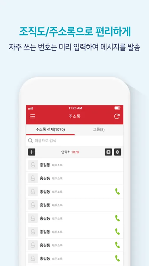 주소록 : 조직도 외 개인적으로 관리하는 개인주소록을 제공합니다. 모바일 연락처를 가져오기 할 수 있으며, 직접 등록도 가능합니다. 주소록 연락처와 전화,문자,메일 등 커뮤니케이션이 가능합니다.