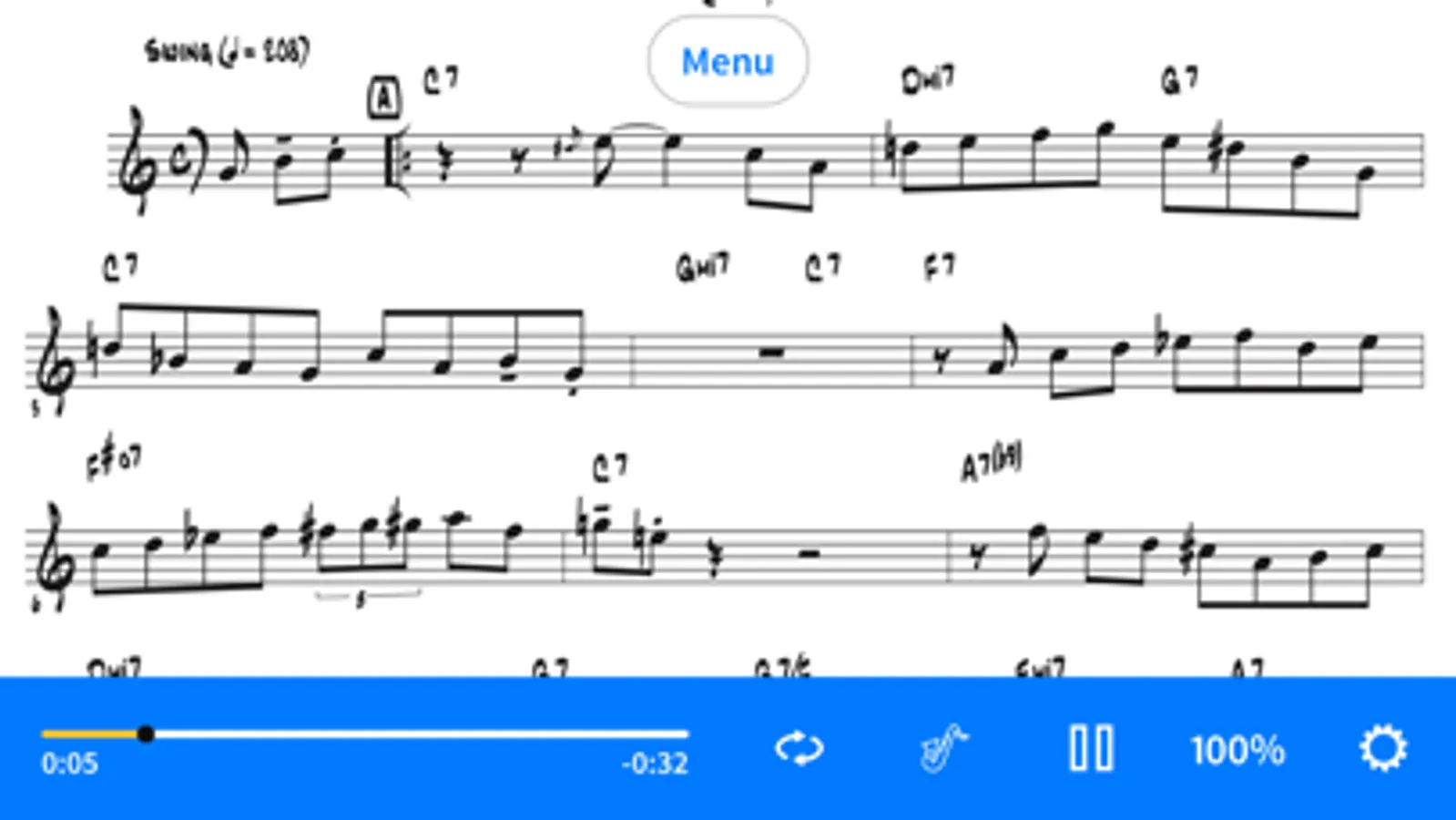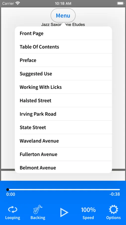 This application features a customized user interface that makes this application fun and easy to use. When you launch the application, you’ll see a menu window that lets you choose to read through the entire contents of Jazz Saxophone Etudes, page by page without the play-along tracks. All page turns are automatic, and synchronized with the play-along track.