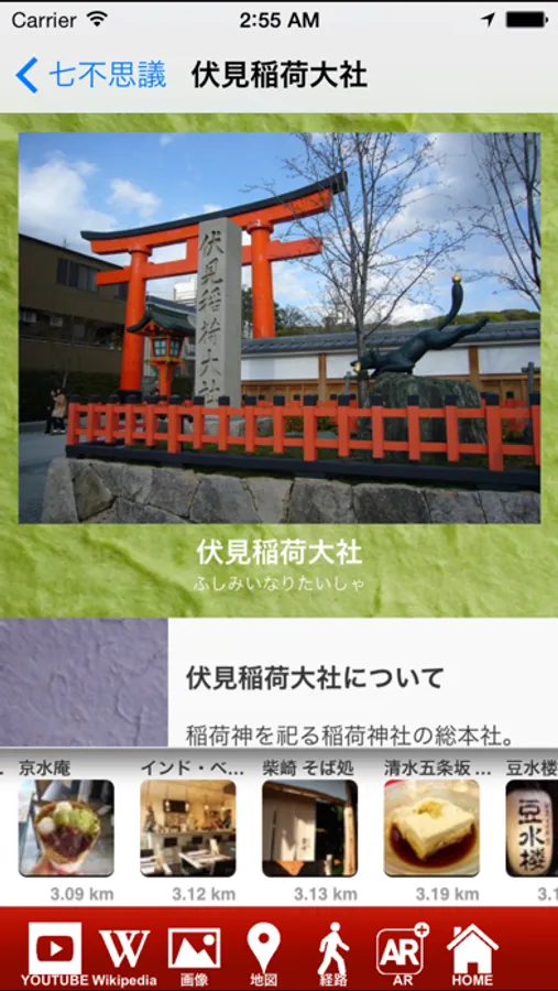 京都参拝案内では、最先端の技術をアプリに搭載しております。現在地から目的の社寺や店舗までのナビ機能に加えもAR技術を使い、目的の社寺、店舗をスマートフォンにビジュアル表示します。この機能を使って頂くことにより、地図だけでは迷いやすい場面でも、確実に目的地に辿り着いていただけます。