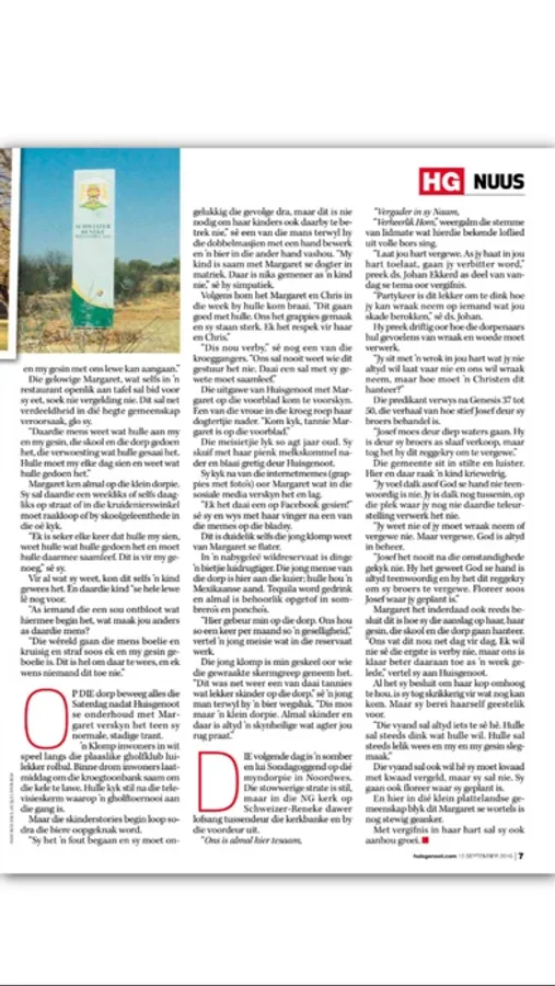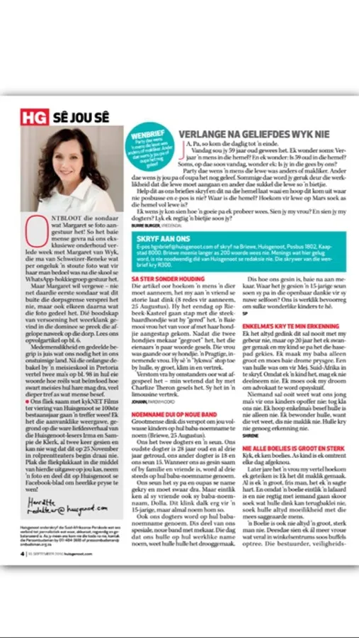 Huisgenoot, Suid-Afrika se topverkopertydskrif, bied topgehalte leesstof en vermaak vir elkeen in die gesin - van nuus, mense-dramas, raad en fiksie tot mode- en glans, doen-dit-selfprojekte, resepte, klaskamerhulp, blokraaie en opwindende wedstryde.
