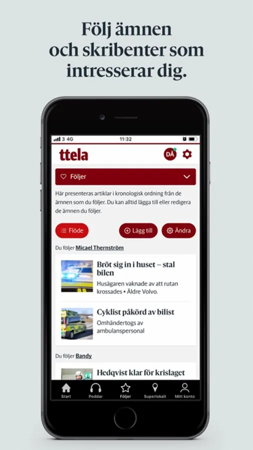 Med TTELAs app kan du följa de ämnen och skribenter som du bryr dig om och skapa ditt eget nyhetsflöde. Du kan dessutom ställa in så att du får en pushnotis när något har hänt inom dina bevakade områden.