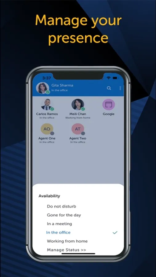 • Manage and automatically update your status and call-routing preferences based on your location or time of day