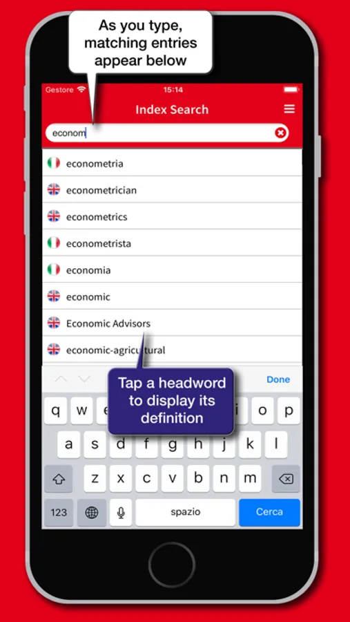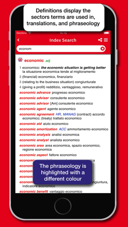 The app Business Dictionary English-Italian/Italian English by Edigeo contains a wide choice of entries and expressions - more than 108.000 over all - together with a great number of usage examples, spanning in all fields of economy and trade.