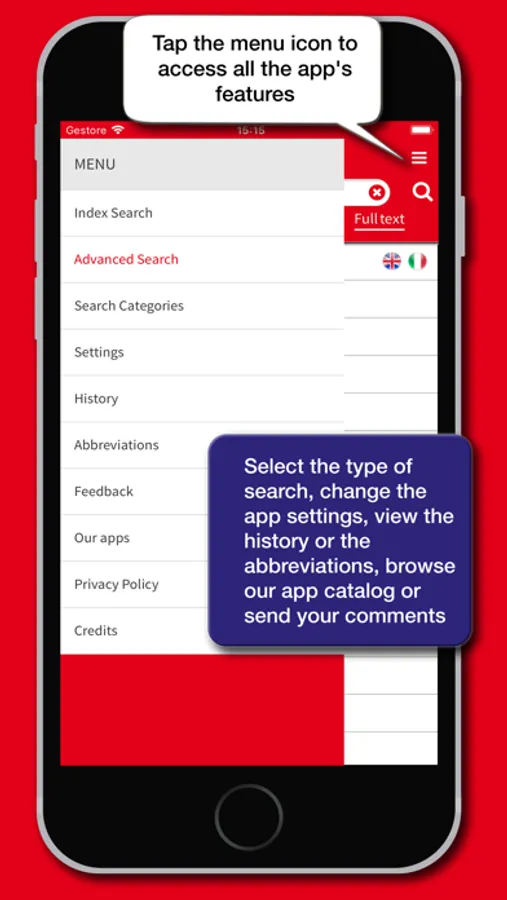 The app's interface has been redesigned to provide a simpler and more intuitive experience. Each definition can be shared using the features available in the device, such as social media, e-mail, SMS, cloud. A main menu that can be activated via an icon available at the top right of the screen enables all the features of the app: