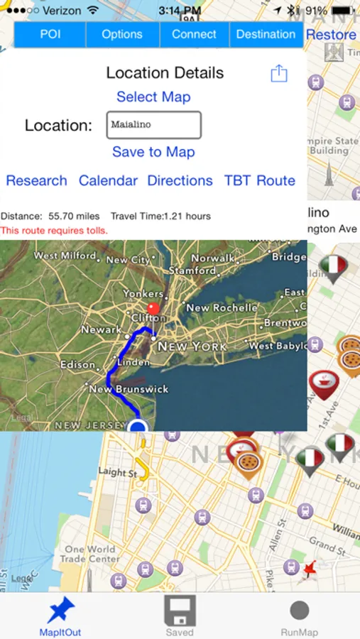 Research each location save the search results to the map for that trip or day right from the details options of the search results.