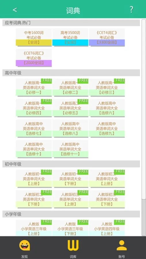 《边玩边学英语单词-九年义务中高考四六级》包含人教版小学、中学、高中、中考、高考、四级、六级词库。