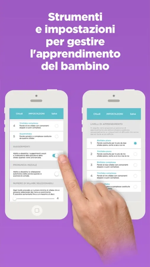 L'applicazione propone alla base un percorso di apprendimento suddiviso su 5 livelli progressivi di difficoltà: dalla costruzione e comprensione di parole semplici a due sillabe, fino alla composizione di parole a quattro sillabe con consonanti doppie e suoni più complessi. Il genitore può gestire l'apprendimento del bambino selezionando dalle Impostazioni il livello più adeguato alle competenze linguistiche dei propri figli e da lì procedere gradualmente verso i livelli successivi.