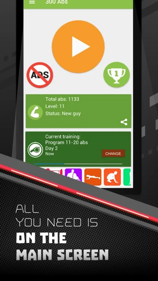 Workouts divided into 21 programme from 0 to 300 sit-ups. Choose the right program for you depending of your training level.