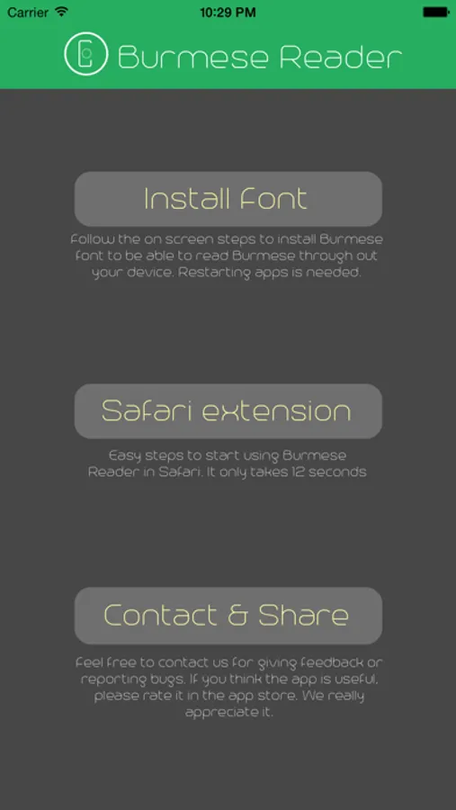 Ever followed a link only to find out it is just boxes? Are you dying to know what your friends commented in Burmese on Facebook? Or did you get a mail or a message that you can't read because it is all boxes? Burmese reader is an easy to use app that enables you to read Burmese letters on your iPhone and iPad. It also includes a Safari extension that lets you read Burmese letters on the web in Safari. It translates all the boxes to Burmese with a single tap. Install it now and you'll never have to go to your laptop to check what those 4 boxes mean.