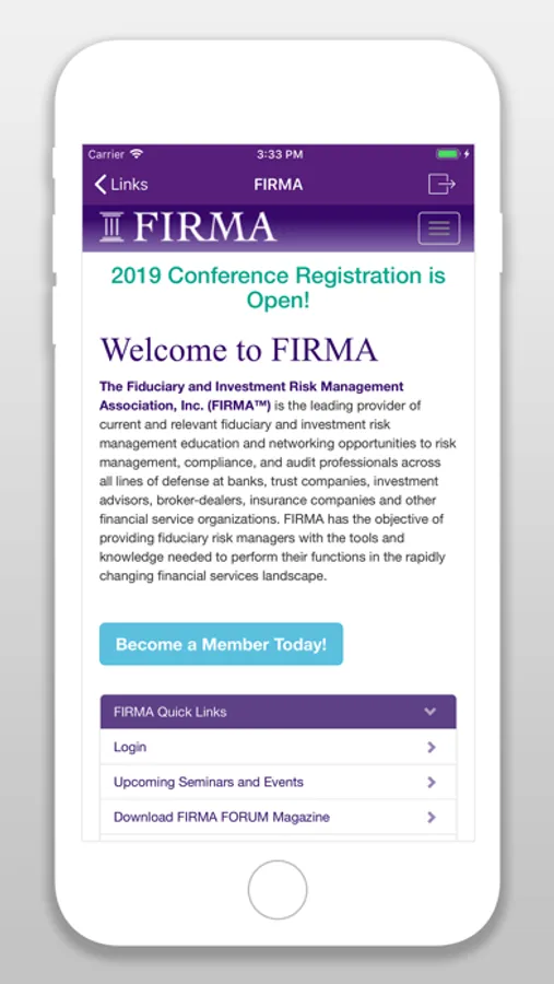 The FIRMA Connect mobile app houses information for FIRMA training events as well as member-value information for FIRMA members. For training events, this app will allow attendees to stay up-to-date with the latest program information and receive real-time notifications from FIRMA. Attendees will also be able to send messages to other attendees privately within the app, view speaker information and facility maps, provide feedback and much more. Our FIRMA Connect downloadable app is available free to paid event attendees and FIRMA members for mobile devices.
