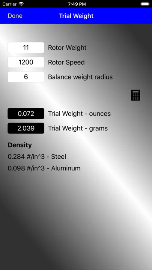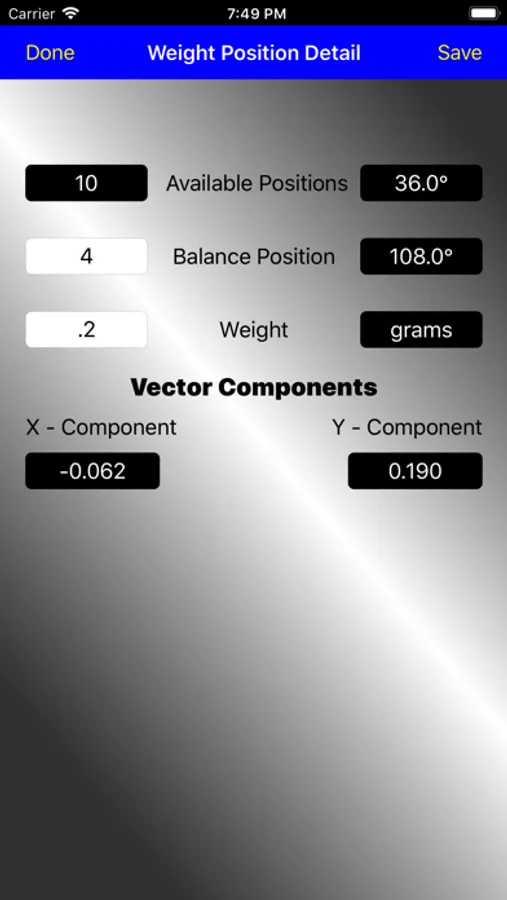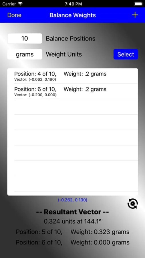 The weight consolidation calculator will help determine a consolidated weight location. Individual weights and positions on the machine are entered into the app. The resultant vector, magnitude and direction, is calculated. In addition, the final weight and positions on the machine will be calculated.