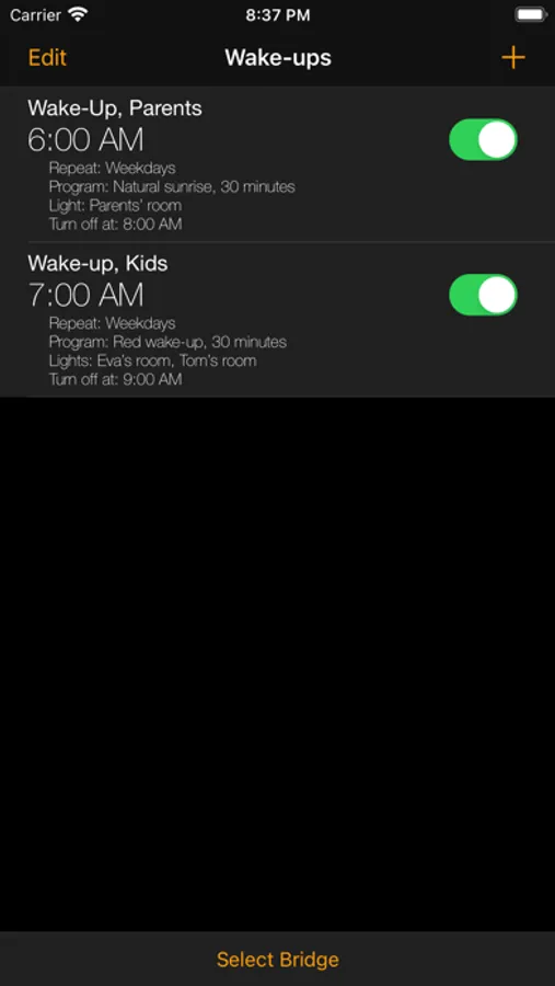 - The app uses five schedules and one light group per wake-up. Since the bridge is limited to 100 schedules and 16 groups, the number of wake-ups that can be created depends on the available space on the bridge.