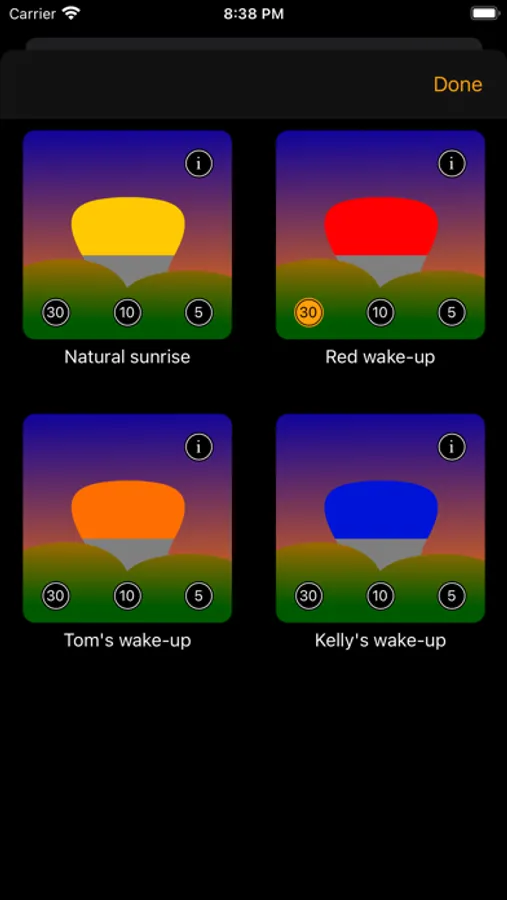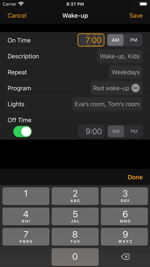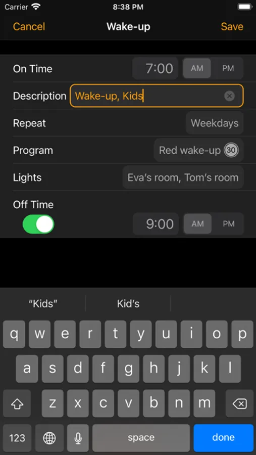 - Select the lights to use, this allows you to do sunrises at different times in different rooms of the house.