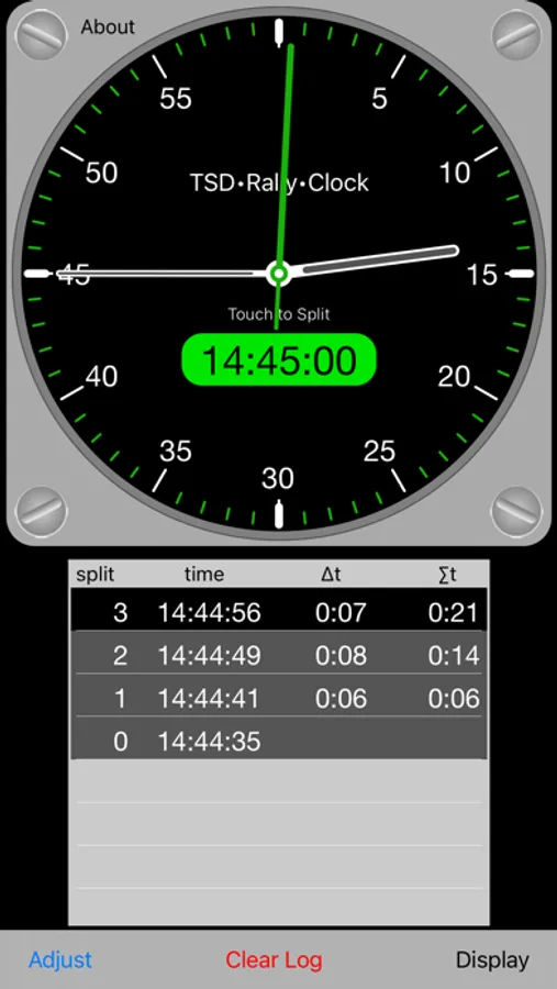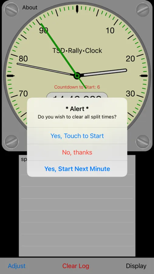 To clear the list of split times, touch the "Clear Log" button and answer the question "Yes." Start the rally by touching the clock face.
