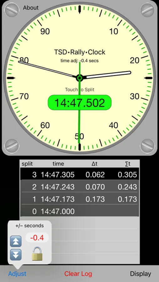 Touch the Lock icon to make clock adjustments. Adjust time ahead or behind as needed and, when finished, touch the Unlock icon to prevent unintended adjustments. Touch the double Arrows singly or continuously to make adjustments in +/– 0.1 second increments.