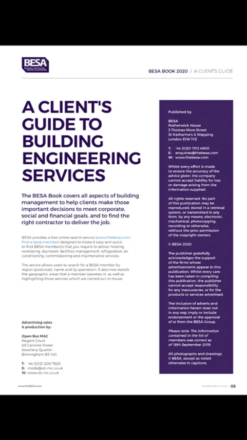 An in-depth guide for anyone looking to procure building engineering services. The B&ES Book covers all aspects of building energy management to help clients make those important decisions to meet corporate, social and financial goals. The B&ES provides a free online search service (www.b-es.org/locate-member/) designed to make it easy and quick to find B&ES member(s) that you require to deliver heating, ventilating, ductwork, facilities management, refrigeration, air conditioning, commissioning and maintenance services.