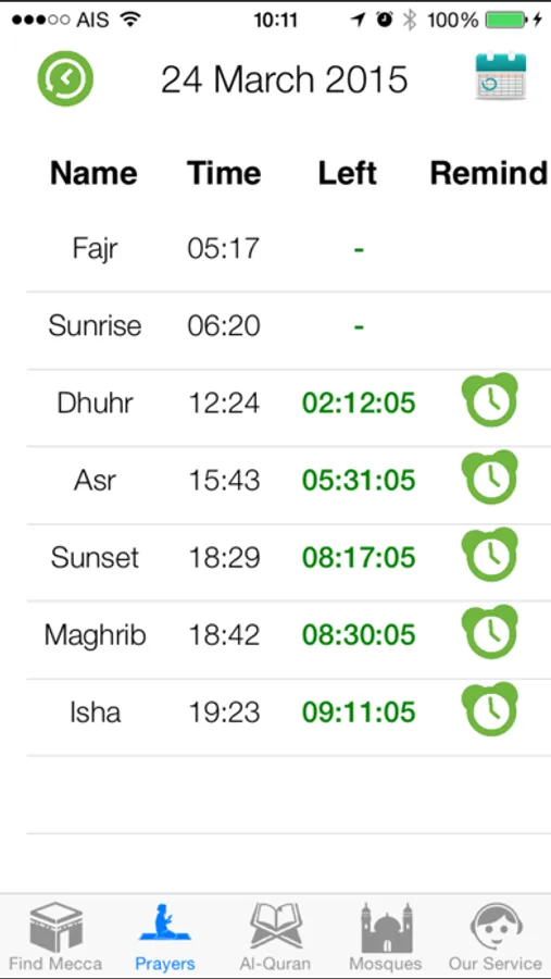 * Displays prayer times for: Fajr, Sunrise, Dhuhr, Asr, Sunset, Maghrib and Isha.