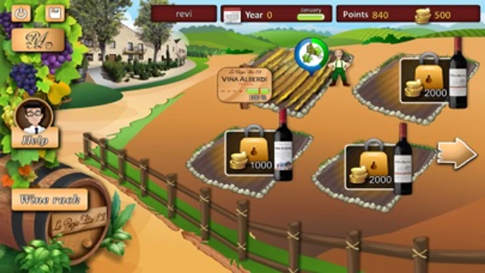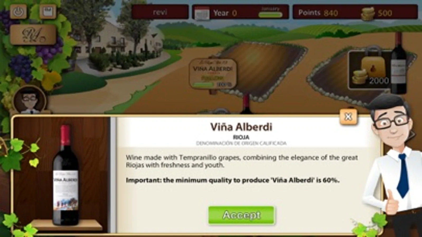 The goal of this educational platform is to serve the orders that arrive at the winery. To do this, players start by planting the vineyards which have to be cared for, fighting the pests that attack them. At harvest time, they need to select and collect only the best grapes and, they have to manually rack the wine during ageing. Finally, they bottle the different brands. This is the only way to serve orders, make greater profits and acquire new vineyards to continue playing.