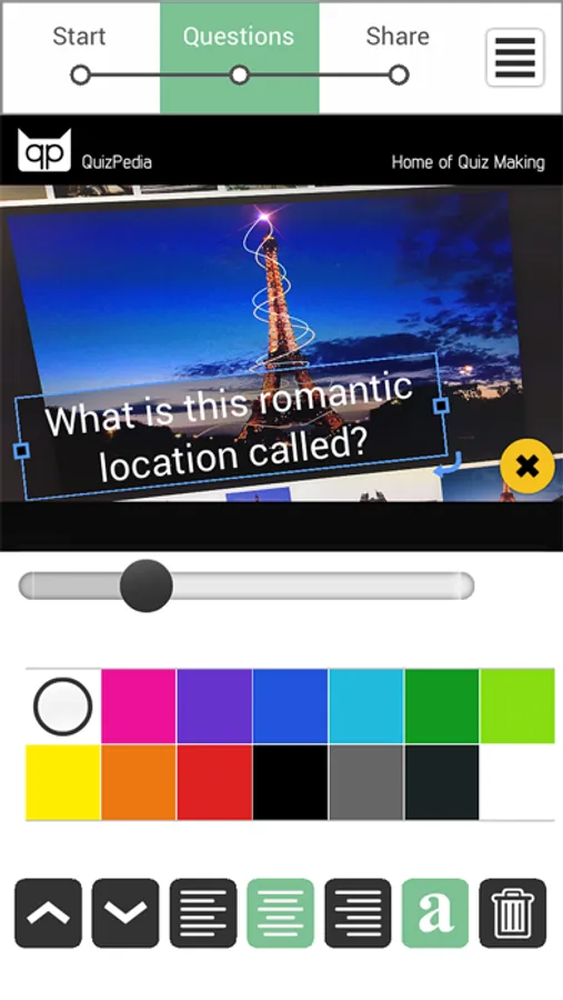 With this app you literally get a hands on experience when creating your own quiz. Try zooming and pinching pictures, rotating and scaling text, changing colors, adding questions. All with the touch of a finger. Or try to use speech to text, to create a quiz within minutes - Make a quiz and see for yourself how much fun it is!