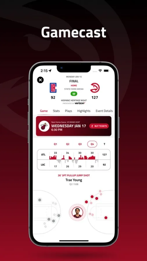 • Hawks version of live gamecast. Get real time shot charts, statistics, and a game flow to see what team has been in control at any given time.