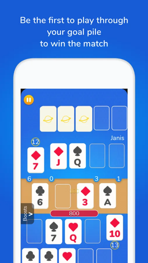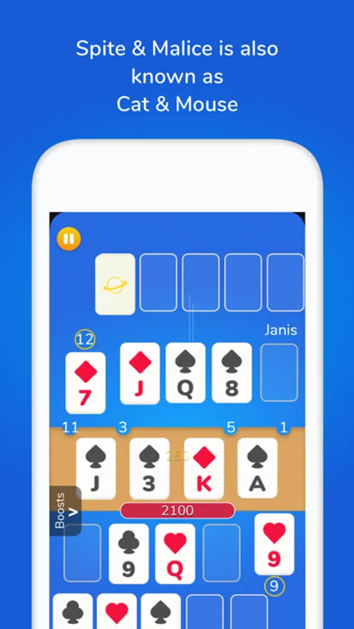 "Spite and Malice" also called "Cat and Mouse" or only "Spite", is a solitaire-game for two players. Be the first to play through his goal pile and win the game. But watch out: Do not overload your discard piles.