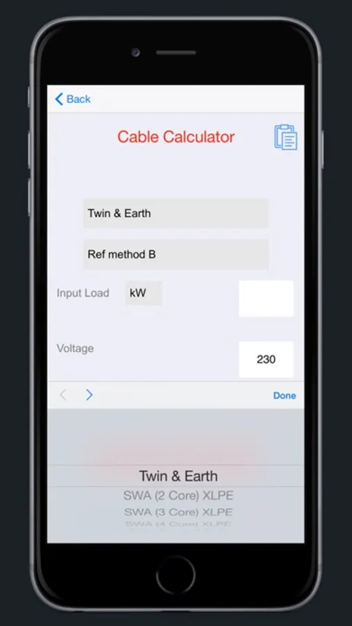 * Calculates voltage drop, percent drop, load and suggests a minimum cable size. Cables include,