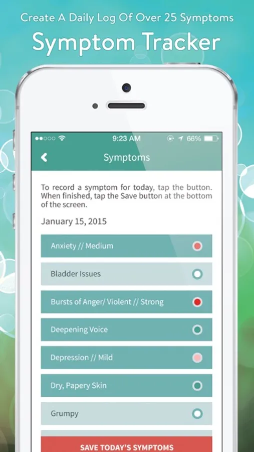 • Symptoms - track over 25 common menopause related symptoms on a daily basis. When you record your symptoms, they are tracked and displayed on a monthly chart easily viewed in the app. You can also email this chart directly from the app.