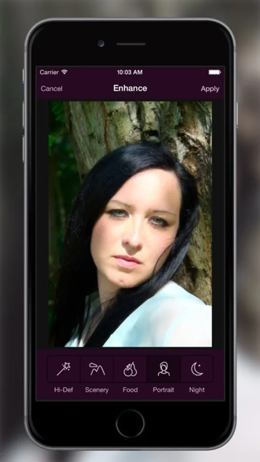 Choose from five one-click preset enhancement options like Hi-Def, Scenery, Food, Portrait and Night to improve photos.