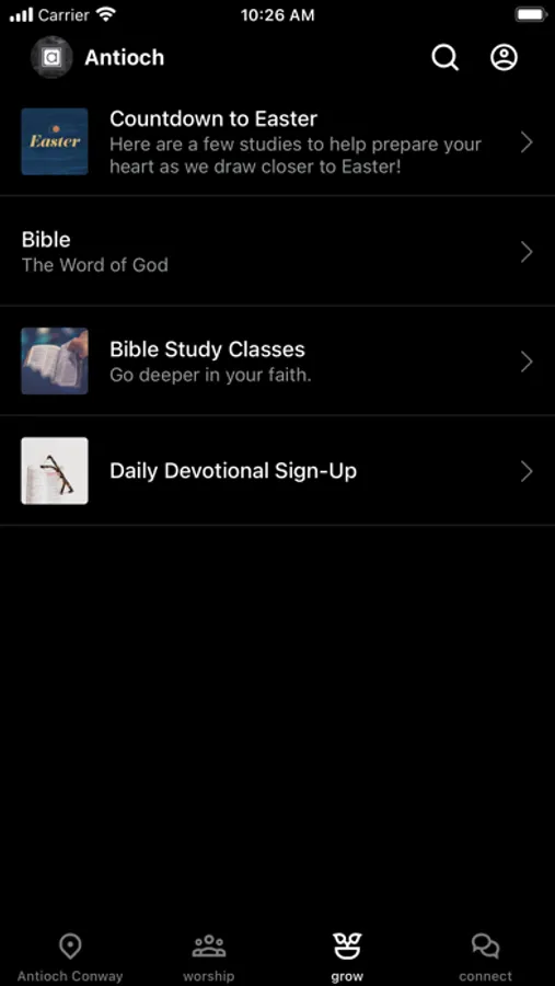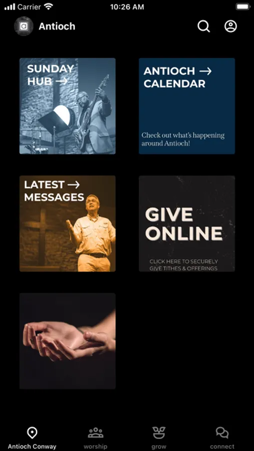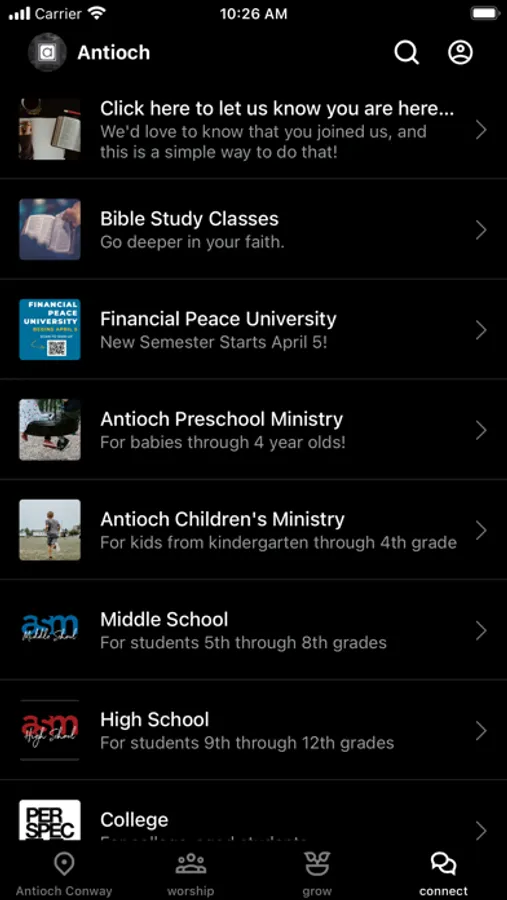 Whether you're a long-time member or thinking about giving Antioch a try, this app will connect you to what is going on and help you see what Antioch is all about. We've divided the app into five easy-to-use tabs: