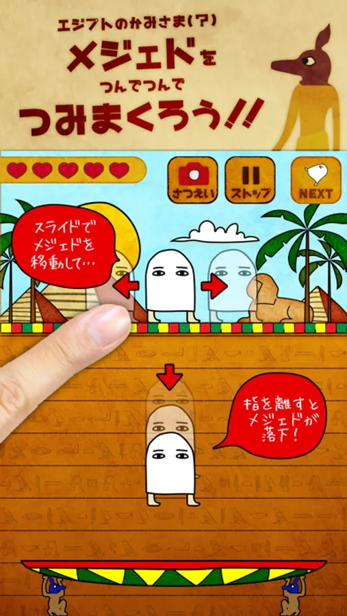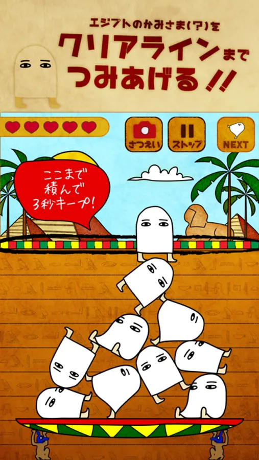 画面上部に現れるいろんなポーズの「メジェドさん」を、クリアラインまで積みあげよう。