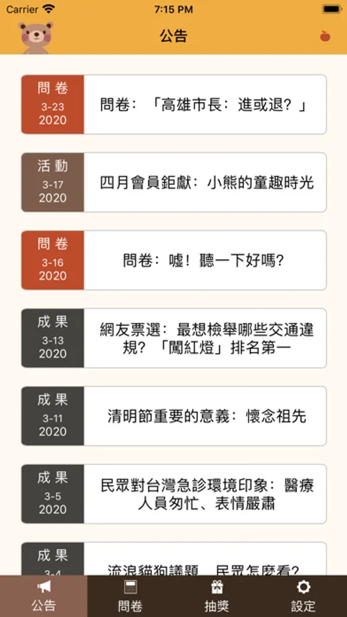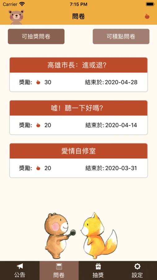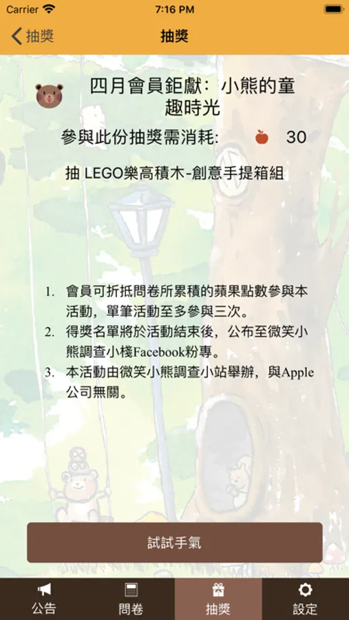 「微笑小熊調查小棧」app除了能方便會員填卷積點外,還能讓您看到最新活動動態,並隨時可以折抵蘋果點數參加專屬的好禮抽獎!小熊是發問專家,總是為每次訪問帶來獨特的風格。跟著小熊進入蘋果樹森林,一起探索社會新奇的事物吧!