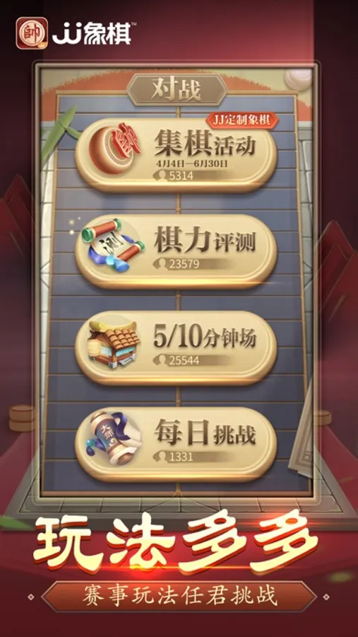 棋力评测、华山论剑、5分钟场、10分钟场,多种对弈模式任君选择,刺激有趣、即开即打。